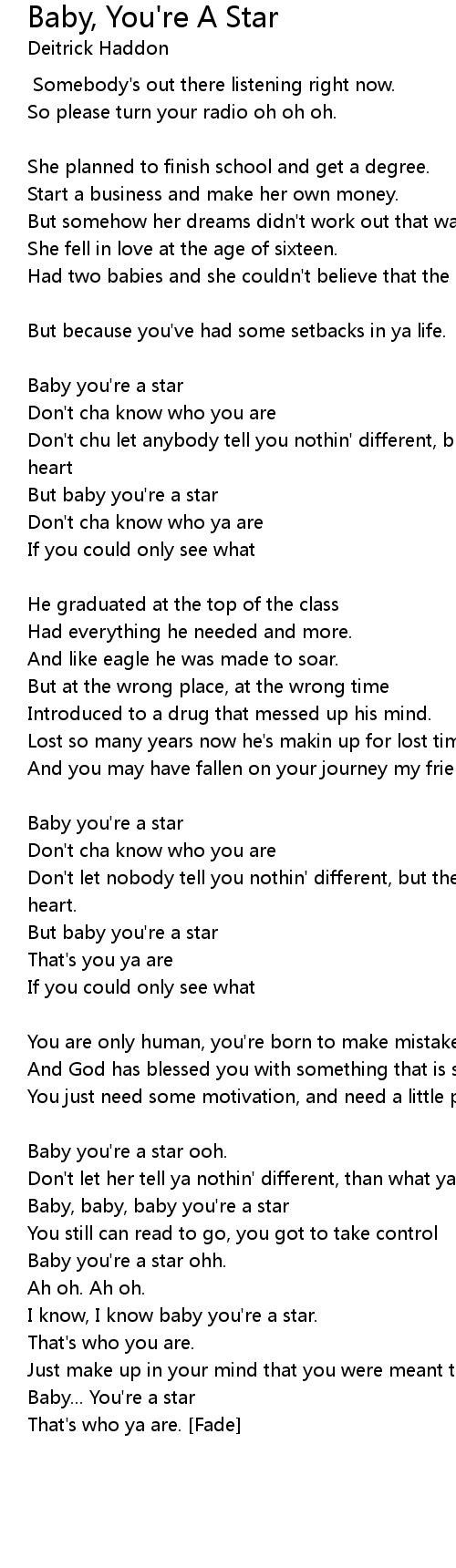Baby youre a star ooh. Intro Somebodys out there listening right now. Provided to YouTube by Sony Music EntertainmentBaby Youre A Star Deitrick HaddonChurch On The Moon 2010 Verity Gospel Music Group a unit of Sony Music.