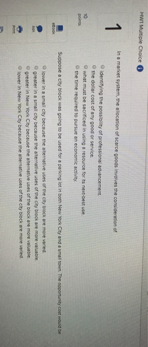 View Econ Chapter 1 HWdocx from ECONOMICS 2111 at Lee College. In a market system the allocation of scarce goods involves the consideration of. The dollar cost of any good or service. Suppose a city block was going to be used for a parking lot in both new york city and a. In a market system how does society decide what goods and services will be produced. In A Market System The Allocation Of Scarce Goods Involves The Consideration Of. The opportunity cost would be.
