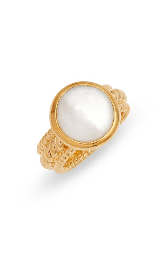 All handcrafted by our artisans. Here a dainty baroque pearl in a smooth bezel setting tops a hand-twisted gold band our newest textural offering. Choose from two fonts.
